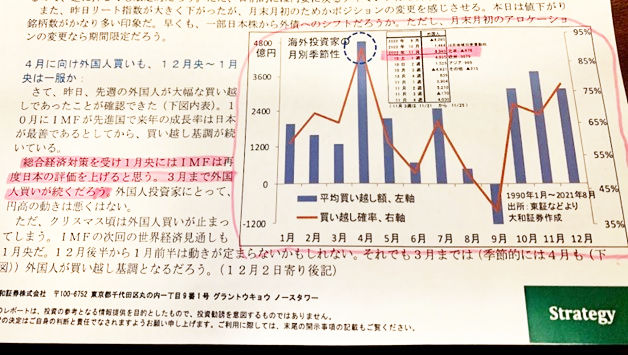 これは12月2日付、大和証券のチーフテクニカルアナリスト兼テーマリサーチ担当の木野内さんが書かれている「木野内栄治のMarket tips」の後半部分です。重要と思われる部分に、私がピンクのマーカーを引いています。 ここに記載の通り、11月の外国人の日本株投資額は8,945億円と、久々に大幅な買い越しとなりました。氏の「総合経済対策を受け、1月にはIMFは再度日本の評価を上げると思う。3月まで外国人投資家の買いが続くだろう」との見解に、私も賛成です。またグラフ「海外投資家の月別季節性」からは、1990年以降これまで11月から来年4月にかけて外国人投資家の買いが継続する傾向があることがわかります。また前述している通り、ウォーレン・バフェットの買いも今後は期待できることも、日本株の需給面でもプラスに働くと思います。
