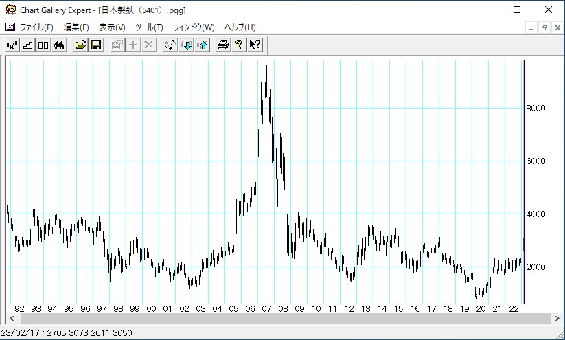 ご参考まで、これは昨日のデイトレ結果です。 日本株の相場観については、今回も基本、変化なしです。冒頭で「浜口銘柄」は、絶好調と認識していますと書いている通りです。。これは前回、前々回のブログでも書いていますが、米国ではインフレ対応でFRBが利上げを連続させていて、それがオーバーキルとなり、米国が景気後退に陥る可能性が極めて高い状況です。しかし、日本は、景気後退にはなる可能性は低いと考えます。米国のインフレ懸念は日本の脱デフレをもたらし、加えて海外観光客の増加等、経済再活動につながり、今年年前半にかけ、日本株はここで紹介している高配当バリュー株を中心とした、堅調な相場展開を予測しています。 さて、以下は8316三井住友FGの過去6か月の推移、株価は2月17日時点の日足です。趨勢的に上昇トレンドが続いていることがわかります。株価については中期的(2年程度)に、10,000円になることをイメージしています。その理由については、以下のブログをご覧ください。 ![]() 三井住友フィナンシャルグループ さや取りについては、今回は特筆すべきものはないので、割愛させていただきます。というより、デイトレがあまりにも儲かるので、さや取り用の信用枠まで使っているというのが実際のところです。 さて、ここからは今回のテーマ、「日本株、投資対象業種は総合商社・銀行・損保・鉄鋼だけで良い」について、考えていきます。 まずは、2023年1月11日付の当ブログ 第45回 PBR一倍割れ銘柄の撲滅は可能か/金利上昇は株価にネガティブ?をご覧いただきたいのですが、以下に要点部分を書き出しておきます。 「金利上昇は株価にネガティブ?」について考えていきます。 米国の著名投資家であるジム・ロジャーズ氏は、金利上昇とインフレにより、株価は大幅下落になるのではないかとの見方をしています。これに対する私の見解ですが、であれば、本件がメリットになる業種から、銘柄選別をすれば良いのではないかと思うのです。 それは具体的には総合商社であり、金融株です。インフレにおいては、商品市況が上昇する。であれば、これがメリットになる業種に投資をすれば良い。具体的には、エネルギーの三菱商事、資源の三井物産と言われますが、この両銘柄で良いのではないか。氏はコモディティに投資した方が良いのではないかと言われていますが、コモディティには配当がありません。したがって私はそれよりも、この2銘柄に投資する方が賢明と考えます。 加えて日本製鉄。過去30年の月足をご覧ください。 ![]() 日本製鉄 相場は上昇中、とりあえずは4,000円を目指す動きと考えます。背景については、以下のブログをご覧ください。 以上です。なお皆さんの株式運用は、くれぐれも自己責任でお願いします。ここは再強調させていただきます。以上です。今回はこの辺で。みなさんの株式運用の参考になれば幸いです。 キーワード検索: #アノマリー #景気循環 #株式サヤ取り |
