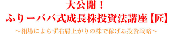 ふりーパパ式成長株投資法講座【匠】で得られるノウハウを一部公開します。ふりーパパ氏が長年実践している「成長株投資法」について、銘柄の選別方法、目標株価の設定、売買戦略の構築、利益確定の方法、ロスカットの仕方、メンタルコントロールなどを事例を使ってわかりやすく具体的に紹介しています。