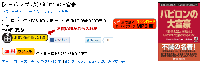 オーディオブックのご購入とダウンロードの方法 手順1:お好みの商品を探して、お買い物かごへ入れる 手順2:ご住所の入力 手順3:お支払い方法の指定 手順4:内容確認・注文完了 手順5:商品のダウンロード キャンセルと返金について 再ダウンロード お問い合わせ 手順1:お好みの商品を探して、お買い物かごへ入れる手順1-2:お会計に進む